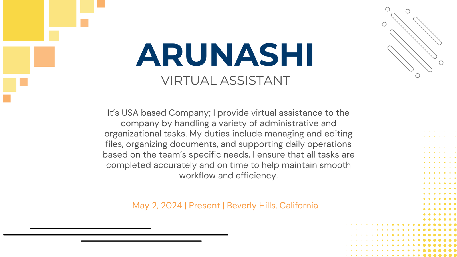 Virtual Assistant & Customer Support SpecialistI work remotely as a Virtual Assistant & Customer Support Specialist with a few well-known companies from the USA, UK, and South Korea. I come from a family that values honesty, respect, and togetherness, and I believe in leading a simple, responsible, and caring life.